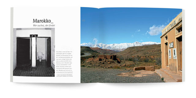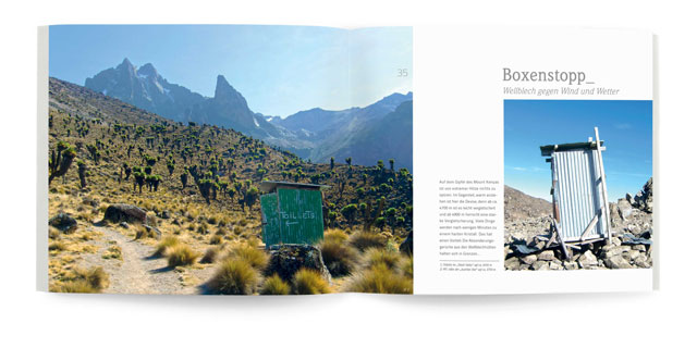 Das größte Kapitel der Fotostrecke dokumentiert unterschiedliche, oft einfallsreiche Anstalten des afrikanischen Kontinents. Oftmals ist Erfindertum gefragt, wie z.B. auf dem Mount Kenya auf 4300 m Höhe. Da wo man es nicht vermuten würde, erblitzt plötzlich eine Wellblechtoilette eingebettet in die umliegende Natur.